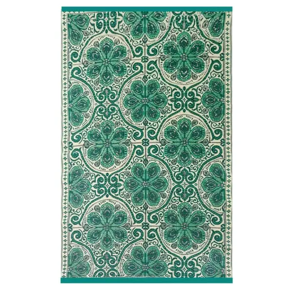 Oriëntaals groen buitenkleed voorzien van een tof design, te gebruiken aan twee kanten. Perfect in de tuin of op het terras!...Uitgebreide product informatie