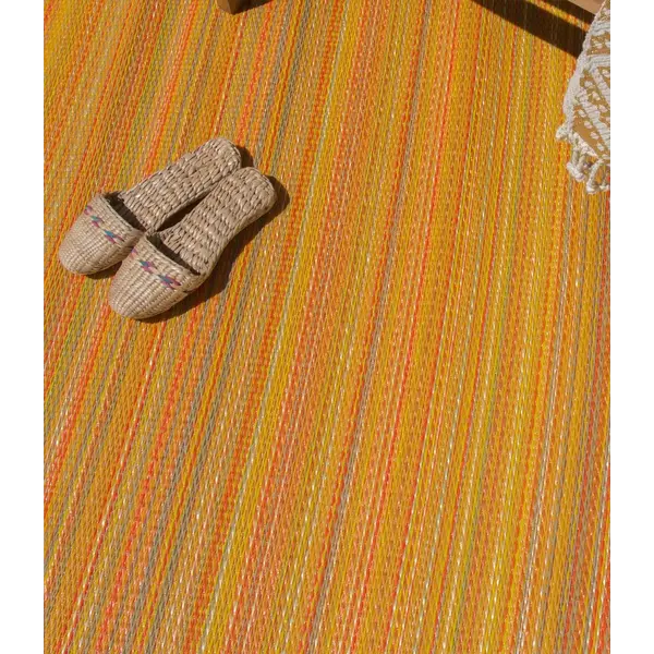 Warm oranje gekleurde kunststof strengen maken dit een vrolijk buitenkleed voor op het terras....Uitgebreide product informatie